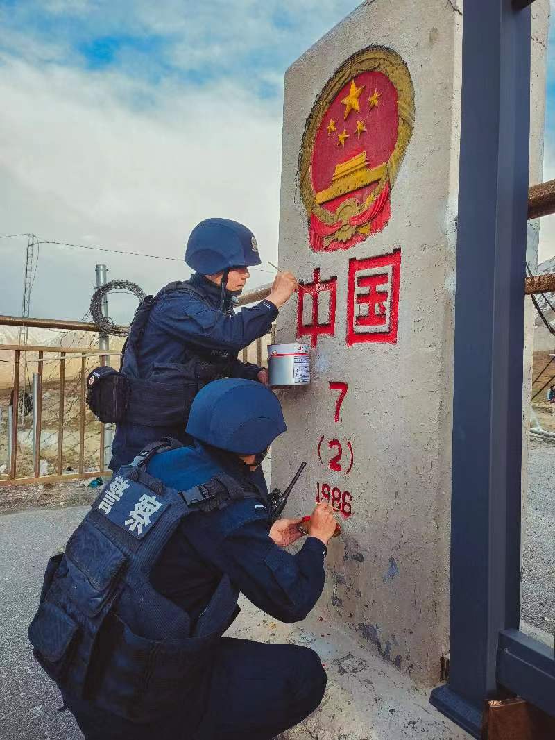 在离天最近、离家最远的红其拉甫,民警们展开鲜艳的党旗,面向党旗庄严宣誓,并为界碑描红。他们身后,祖国大地举国欢庆,万家团圆。