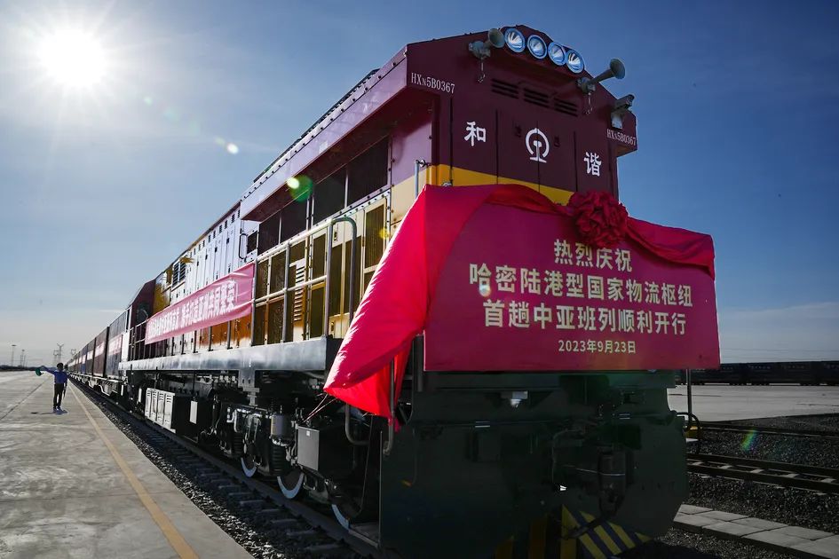 当天,在哈密陆港中心城北物流港物流枢纽多式联运中心,一列刚刚集结完成的中亚专列满载38车来自山东地区的货物,将经霍尔果斯口岸,发往中亚地区。这是哈密历史上首次开通向西的国际货运班列,也是哈密陆港中心首趟开行向西的中亚班列。