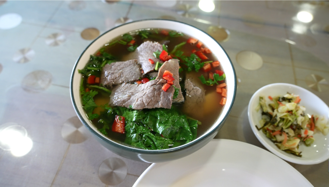 一碗标准的五台杂烩汤里,有牛肉丸、牛肉片、粉条、豆腐、菠菜等,以牛骨汤浇煮,葱花、香菜提味,配以金黄酥香的吊炉烤饼和酸爽的小菜,其味鲜香可口。几十年来,在过往旅客与司机的口口相传中,五台杂烩汤声名远扬。