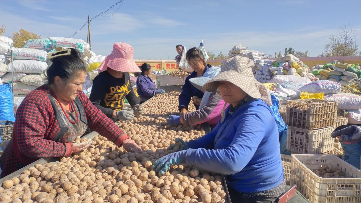 11月1日,在乌帕尔镇的穗缘农副产品农民专业合作社,村民们陆陆续续将自家的核桃拉运到合作社售卖。在合作社大院内,机器轰鸣,工人们正在有条不紊地进行核桃的清洗、分拣、挑选、装袋、搬运等工作,现场到处呈现着繁忙的丰收景象。