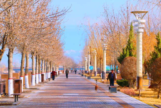 3月24日10时29分,博湖县百信休闲公园,群众在雨后散步。王陆斌 摄