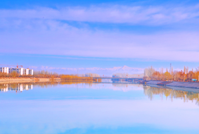 3月24日晨,开都河宝浪苏木栏河闸附近碧水雪山、蓝天白云构成雨后美景。王陆斌 摄