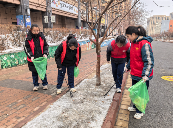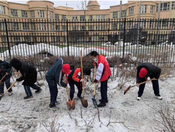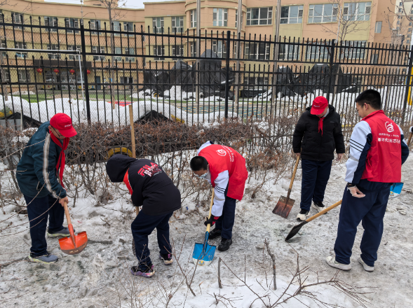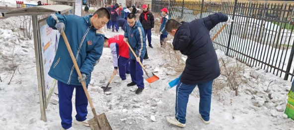 活动当天,师生们热情高涨,积极参与。他们身穿统一的志愿者红马甲,手持清扫工具,分组行动,对辖区主干道路内的公共区域进行了全面的清理。在大家的共同努力下,辖区的环境焕然一新,冰雪被清理干净,垃圾和烟头也被一一捡起。