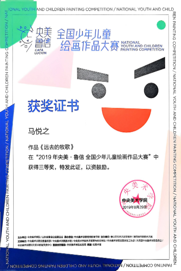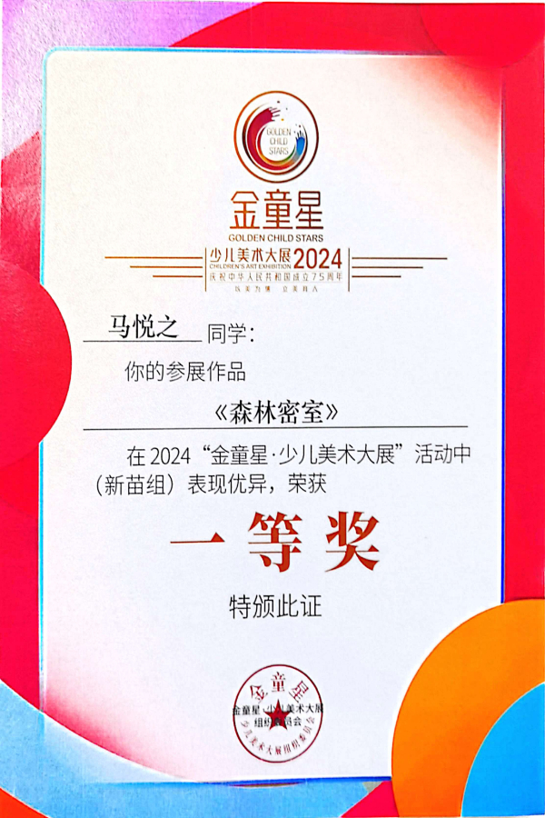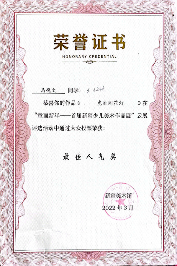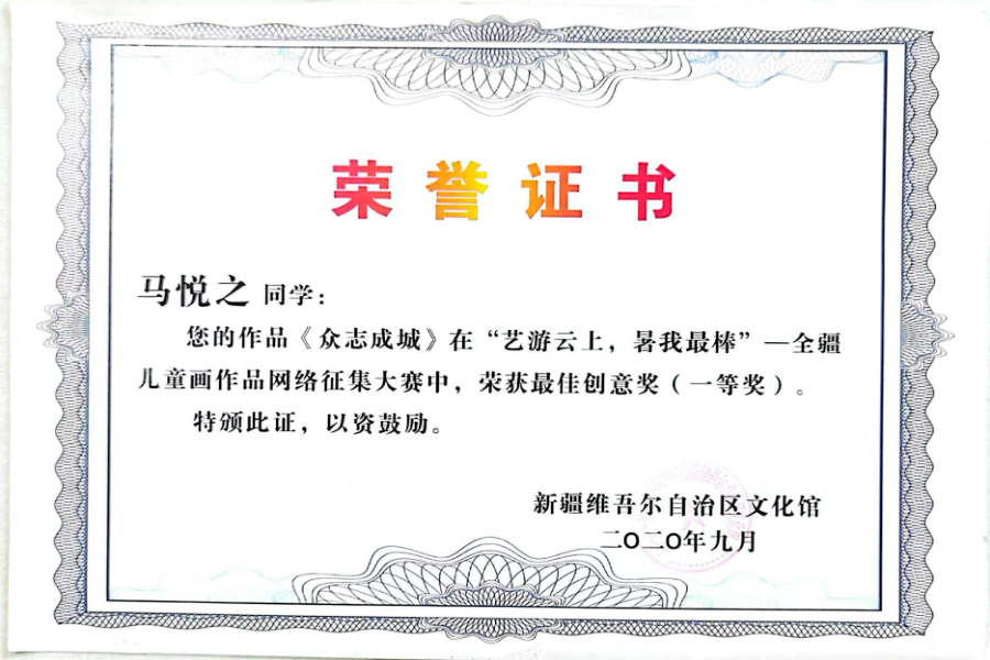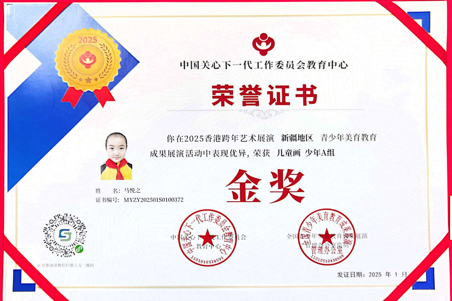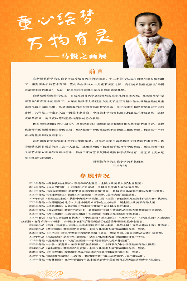 马悦之是新疆教育学院实验小学六年级三班的学生。她自幼酷爱绘画,自幼儿园首次个展后便展现出非凡的艺术天赋。在实验小学"全面发展"教育理念的滋养下,六年间她以惊人的创造力完成了近五百幅作品:从稚趣盎然的儿童画到气韵生动的水墨,从灵动洒脱的速写到前沿的数字绘画,多元探索中始终贯穿着对艺术的赤诚。其作品二十余次入选中国美术家协会、中央美术学院等权威机构展览并屡获嘉奖,这份成绩单背后,是日夜执笔的坚持与师长的悉心栽培。