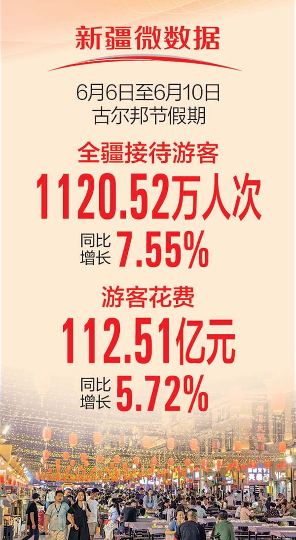 记者从自治区文化和旅游厅获悉:6月6日—10日古尔邦节假期,全疆共接待游客1120.52万人次,同比增长7.55%;游客花费112.51亿元,同比增长5.72%。各地通过深挖传统文化内涵、创新消费场景、拓展旅游业态,全力推动节日期间文化和旅游消费提质升级。