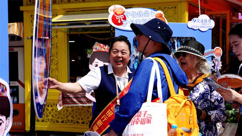 现场群众积极踊跃参加金融知识有奖问答,兴致盎然地手持交行印制的新疆馕图案双面“防非”图文宣传扇,还参观了防范非法集资图文展板,并在交行“艾德莱斯绸”特色美窗展点打卡留影,成为夏季大巴扎一道亮丽的风景线。