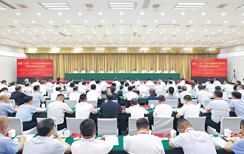 6月24日,新疆“三北”工程攻坚战暨塔克拉玛干沙漠边缘阻击战推进会在和田召开。自治区党委书记、兵团党委第一书记、第一政委马兴瑞出席会议并讲话。□石榴云/新疆日报记者崔志坚摄