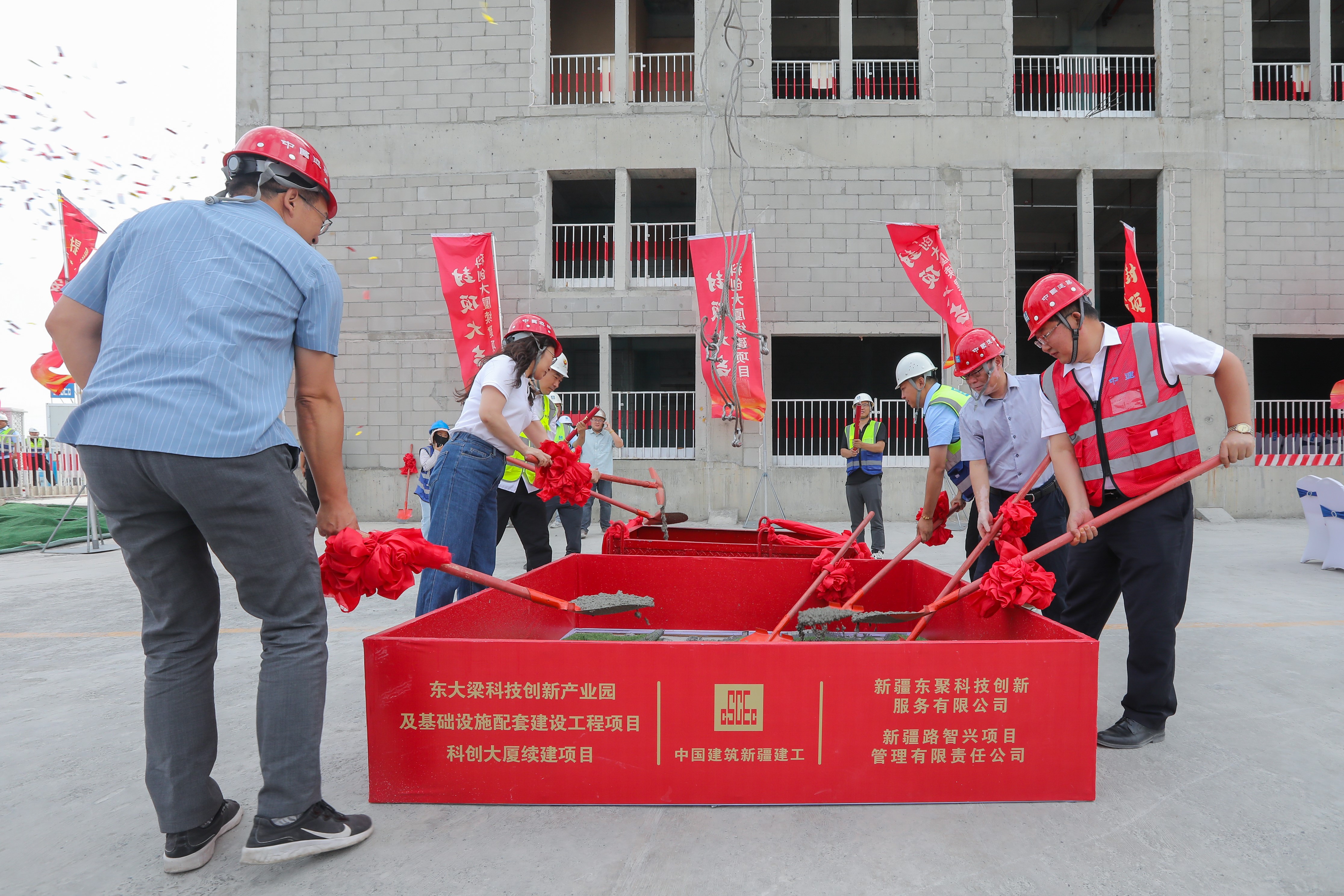乌鲁木齐市天山区发改委主任冯海蓉;乌鲁木齐市天山区科学技术局党组书记符新辉;乌鲁木齐天山区城市建设项目管理有限公司总经理刘涵;中建新疆建工四建党委副书记、总经理吕尚军;新疆路智兴监理项目管理有限责任公司科创大厦续建项目总监李小路出席封顶仪式。