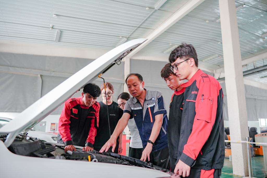 2025年6月27日,在新疆和田技师学院,北京援疆教师李宝(右三)和当地教师一同指导学生维修汽车。新华社记者 徐宏岩 摄