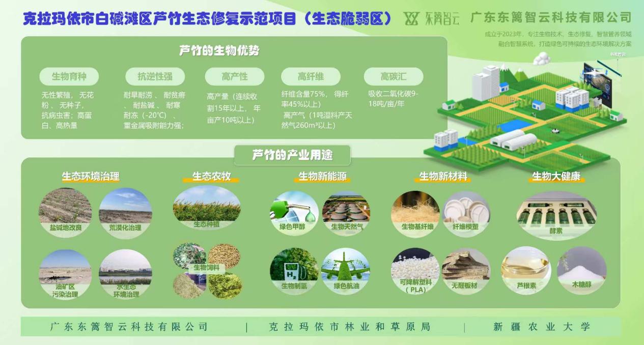由东篱智云主导的“芦竹生态链项目”,通过引入耐盐碱、抗逆性强、生物量大的新优芦竹品种——金竹草,结合自主研发的智能灌溉系统,以AI技术赋能精准修复生态脆弱区。打造集“种植、加工、研发及销售”于一体的全产业链,