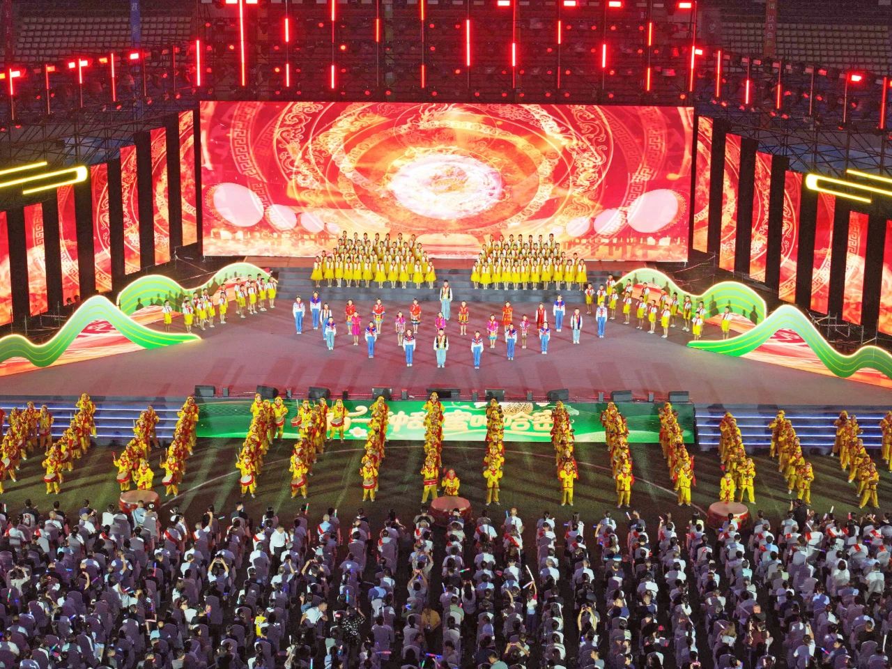 威风锣鼓和童声合唱现场。哈密市融媒体中心记者 李华摄