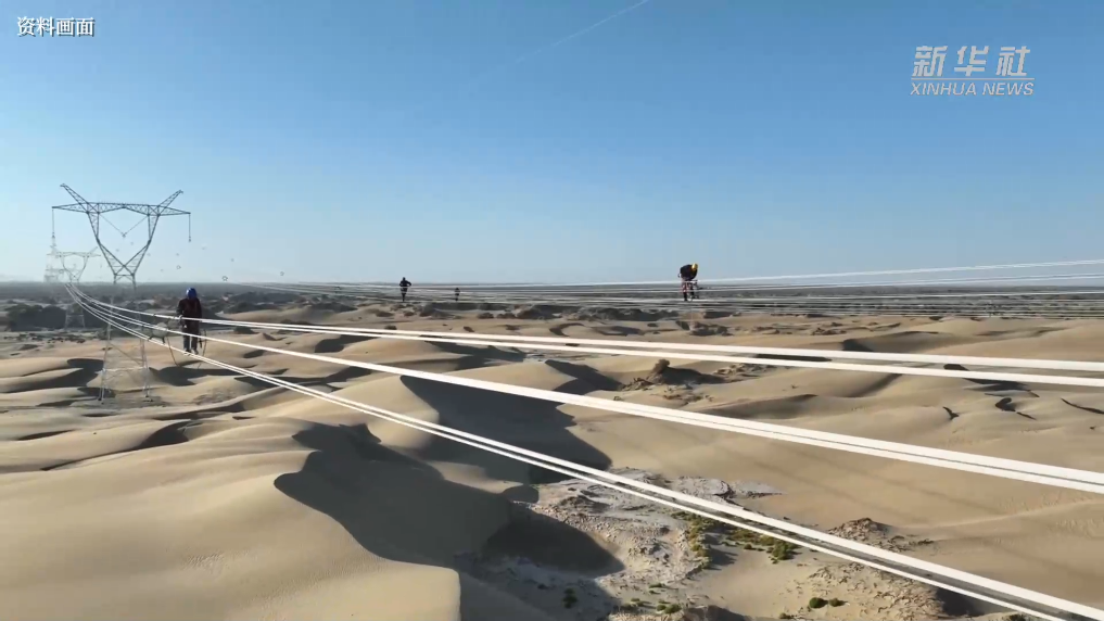 7月13日,在塔里木盆地南缘的新疆和田地区民丰县,牵引机将最后一段电线成功从183号铁塔拽至188号铁塔,标志着历时15年建设的环塔里木盆地750千伏输变电工程全线贯通。