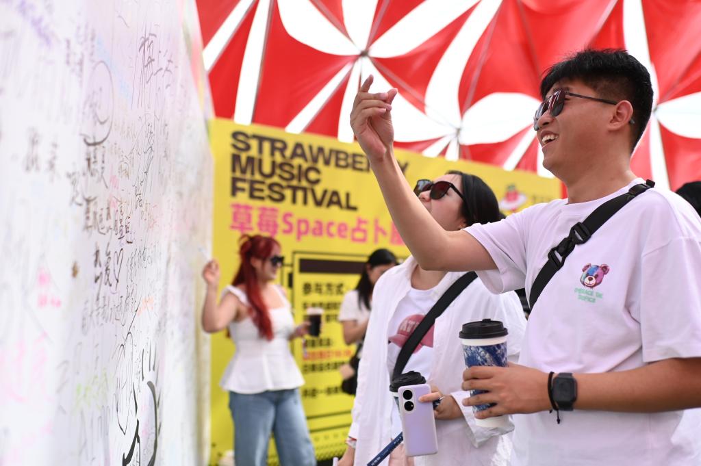 7月12日,在2025新疆超级草莓音乐节现场,人们参加签名墙活动。新华社 发(徐锐 摄)