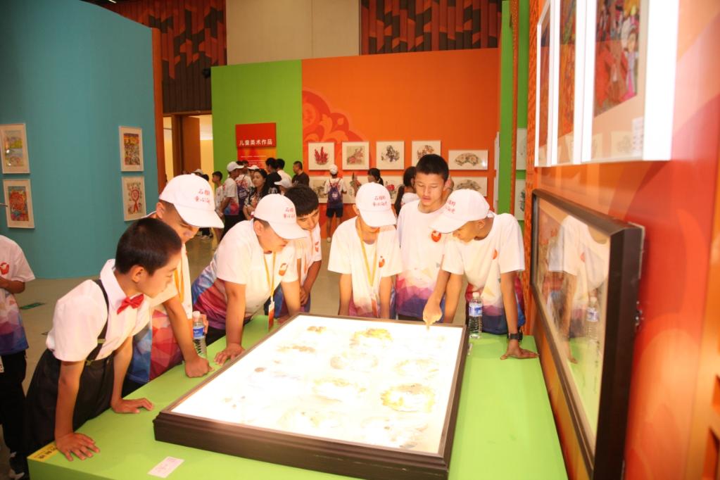 7月14日,研学夏令营营员参观“七秩芳华 共绘未来”新疆妇女儿童美术作品展。(图片由中国妇女儿童博物馆提供)