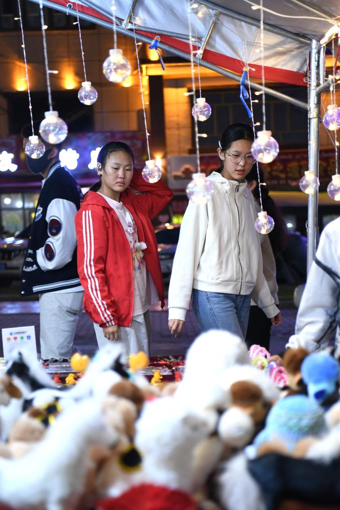 7月17日,在改造后的昭苏县天马旅游街区,两名女孩被市集上的玩偶吸引。新华社记者 谢秀栋 摄