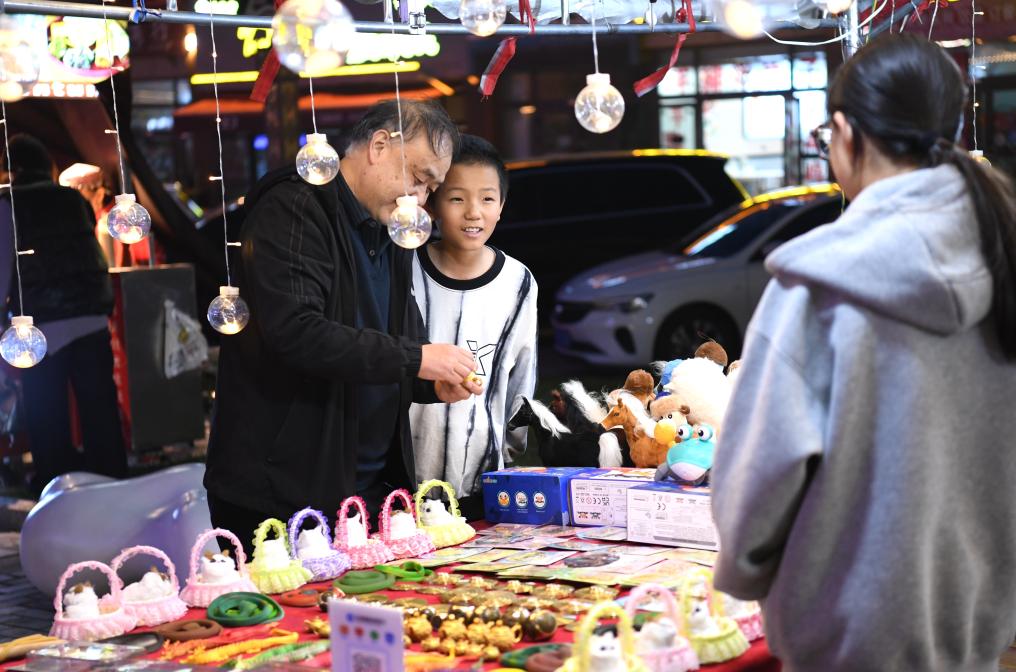 7月17日,在改造后的昭苏县天马旅游街区,一名男孩在市集的摊位上询价。新华社记者 谢秀栋 摄