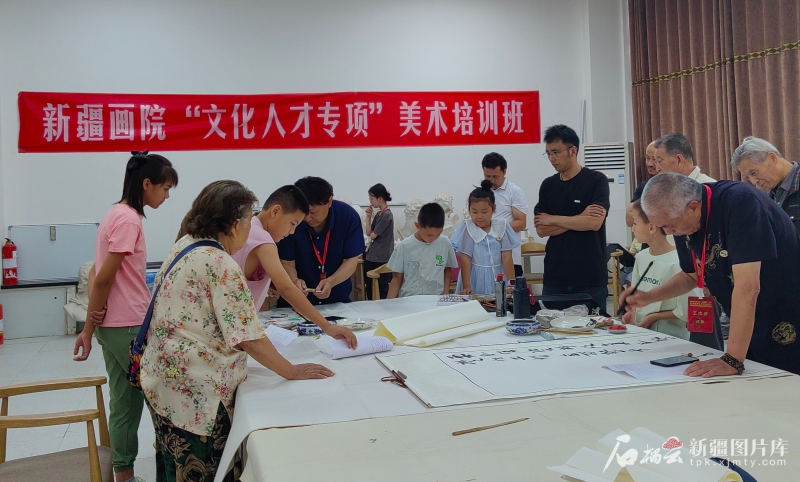 “老师,能再示范一次篆书笔法吗?”在柯坪县书法培训现场,书法爱好者们围着乌鲁木齐市书法家协会副主席程配建不愿散去。“石榴籽”文艺小分队书画家们采用“培训+创作”模式,在阿克苏各地开设书画培训专项课堂,为众多基层文化工作者与爱好者们传授技法,将“送文化”与“种文化”相结合。