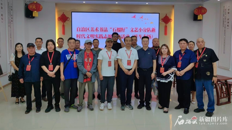 自治区美术书法“石榴籽”文艺小分队,在库车市捐赠作品进行合影留念。红梅 摄