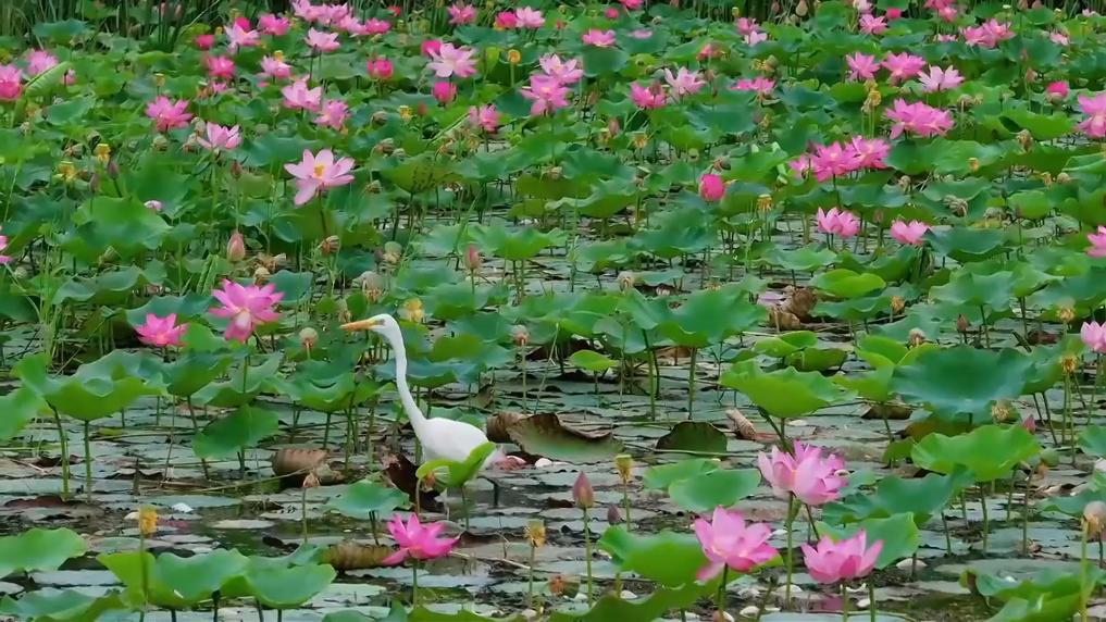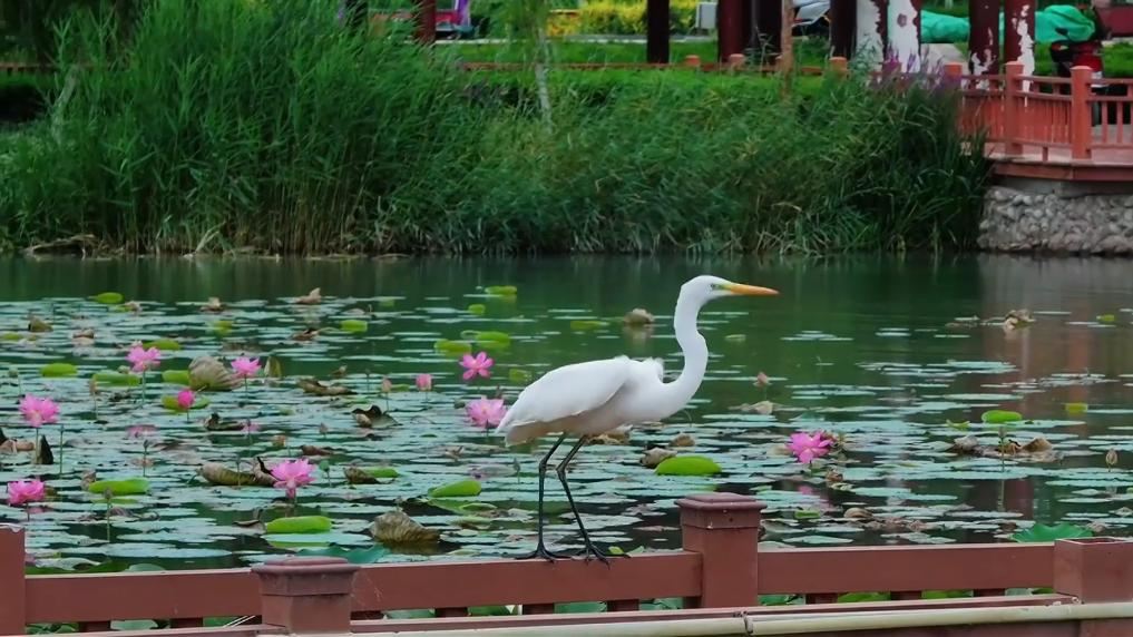 盛夏时分,位于塔克拉玛干沙漠北缘的库车市荷花盛放,引来白鹭翩跹。