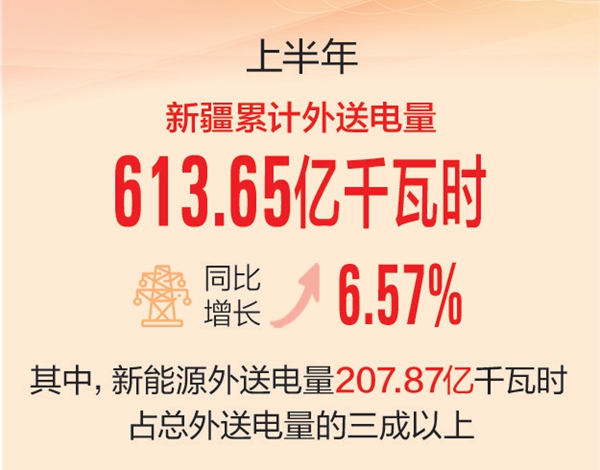 记者从国网新疆电力有限公司获悉:上半年,新疆累计外送电量达613.65亿千瓦时,同比增长6.57%。其中,新能源外送电量达207.87亿千瓦时,占总外送电量的三成以上。