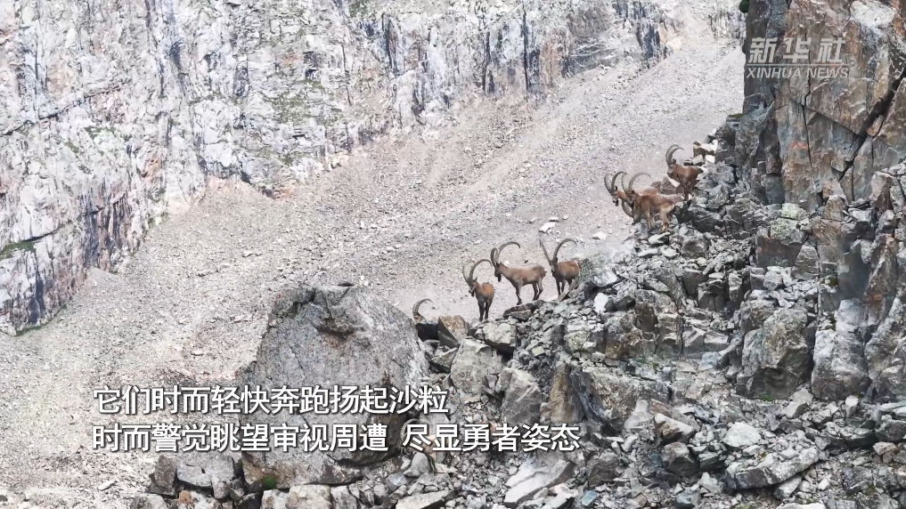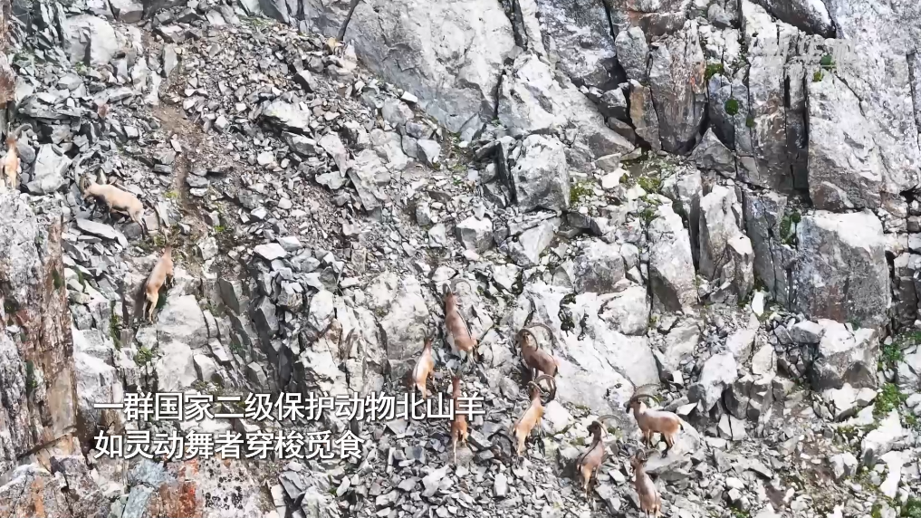 近日,在新疆伊犁哈萨克自治州昭苏县骆驼峰,海拔3000多米近乎垂直崖壁上,一群国家二级保护动物北山羊如灵动舞者穿梭觅食。