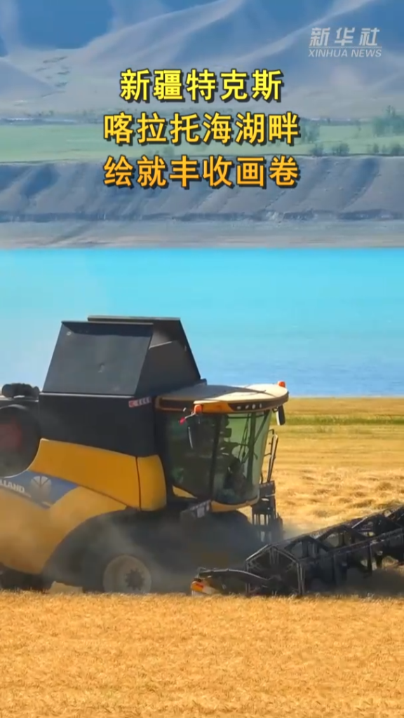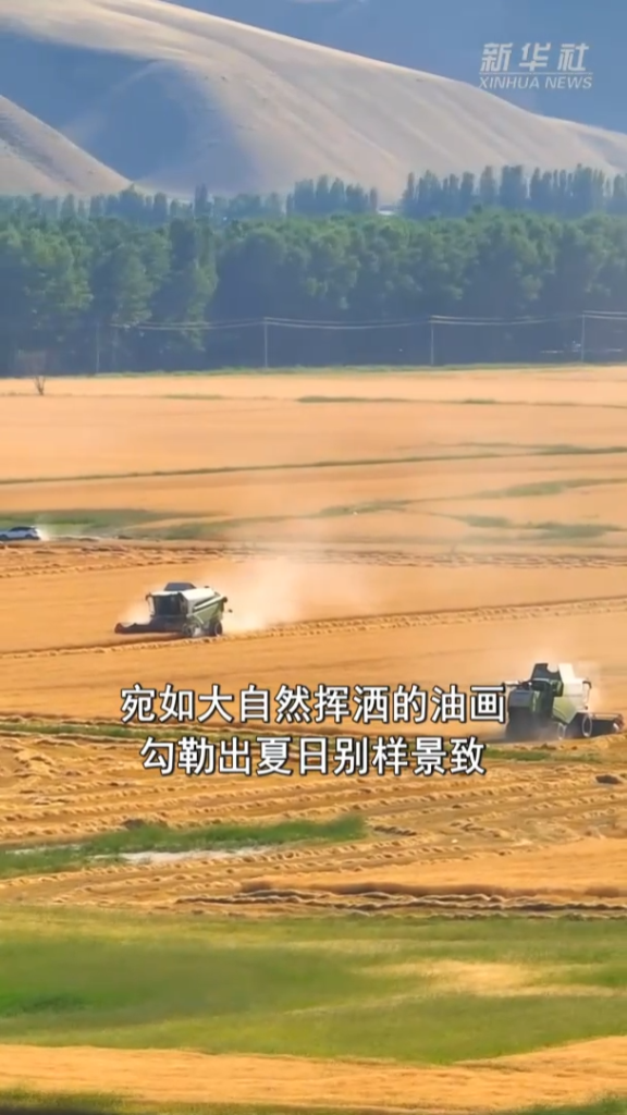 金黄的麦浪与碧绿的湖水交相辉映,宛如大自然挥洒的油画,勾勒出夏日别样景致。田间收割机穿梭作业,奏响夏日的丰收乐章。