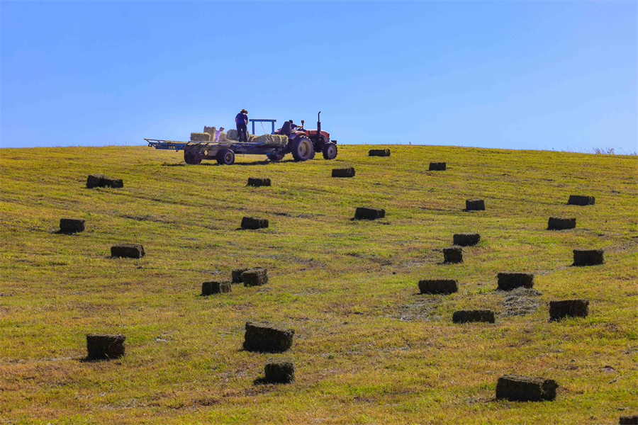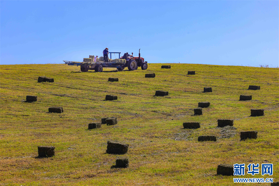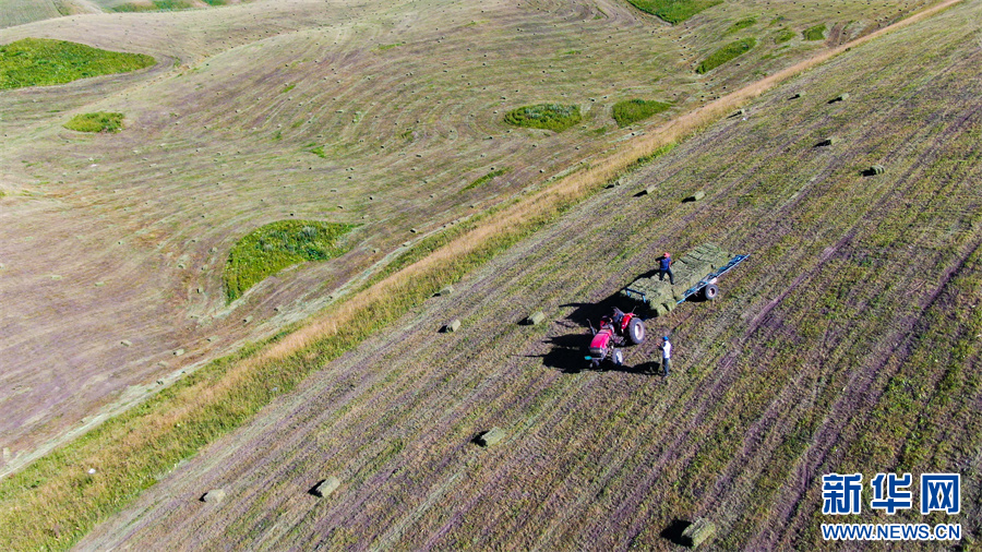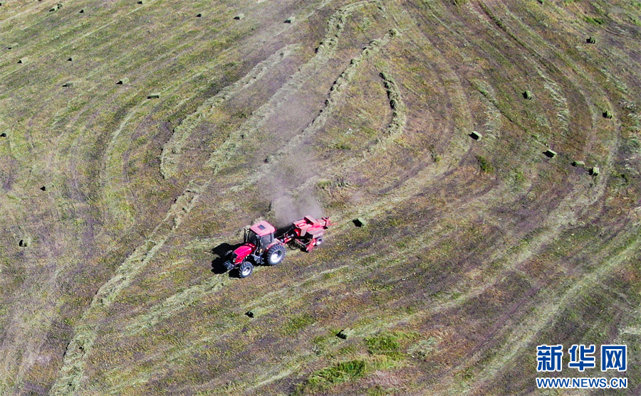 盛夏时节,新疆新源县各牧场迎来了一年一度的打草收获季。广袤的草场上,各类牧草收割机械往来穿梭,割草、搂草、打捆、装车等工作有条不紊地进行着,一个个方形草垛如珍珠般散落在草场上,勾勒出一幅热闹而壮美的草原丰收画卷。