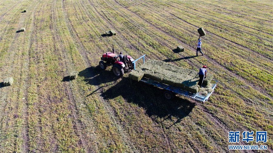 在新源县则克台镇巴音托玛草场,收割完牧草后,方形的草垛散落在草原上,等待拉运。