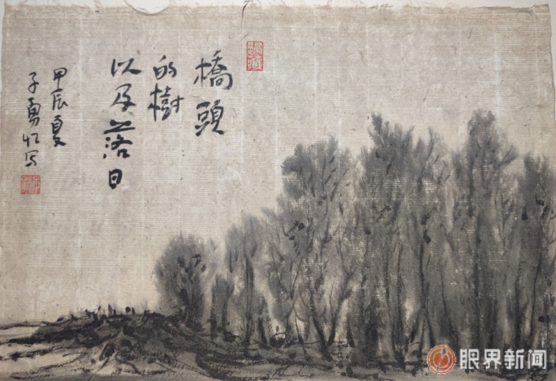 韩子勇中国画作品《桥头的树及落日》。记者赵剑尘 摄