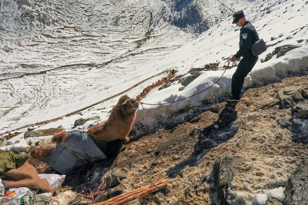 9月6日,诺尔特路段湿滑致驼队失稳,辅警木拉·赛勒克别克协助牵引骆驼前行。新华社发(叶尔江摄)