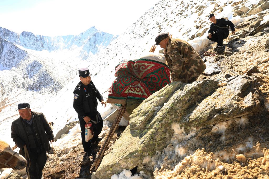 9月6日,库尔木图边境派出所民警叶尔兰别克·海吾热拉为穿越诺尔特山的牧民护航。新华社发(叶尔江摄)