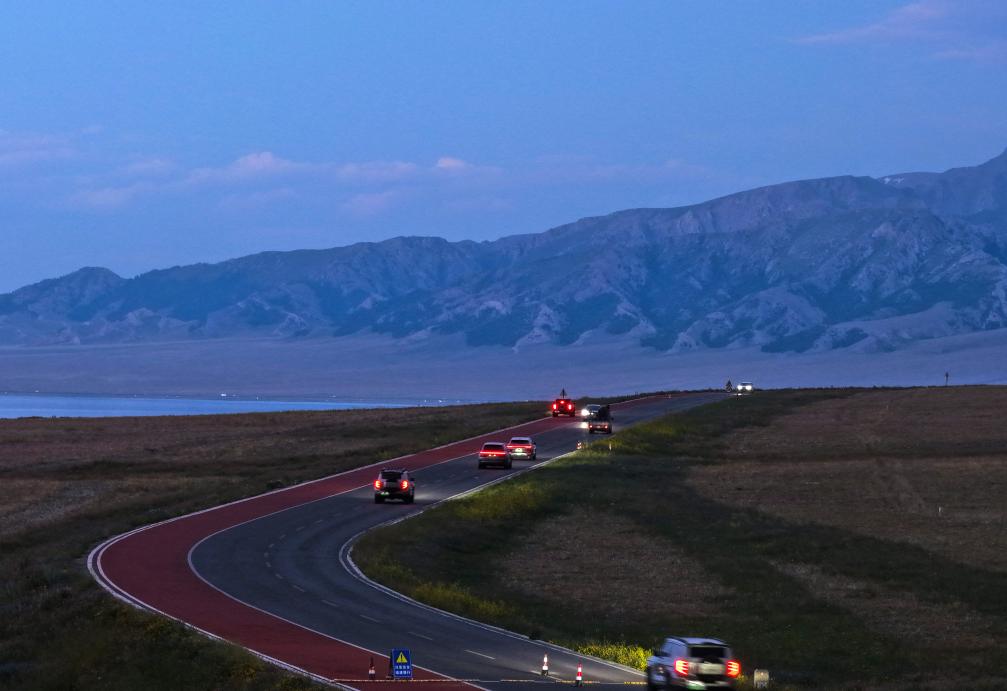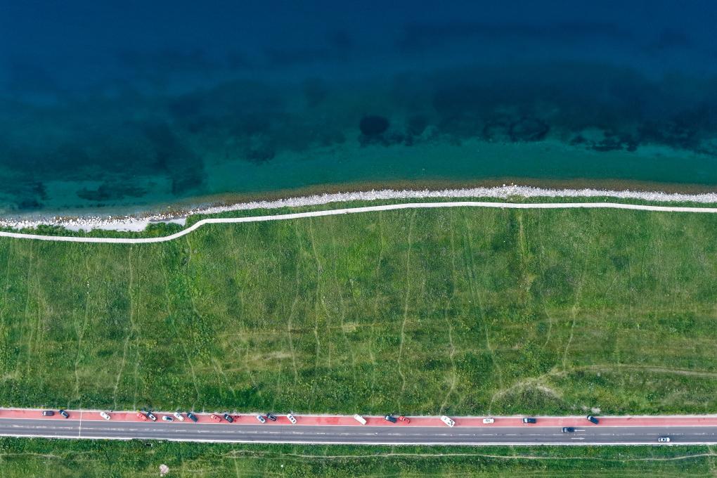 游客驾车行驶在赛里木湖景区(无人机照片,7月8日摄)。新华社记者 辛悦卫 摄