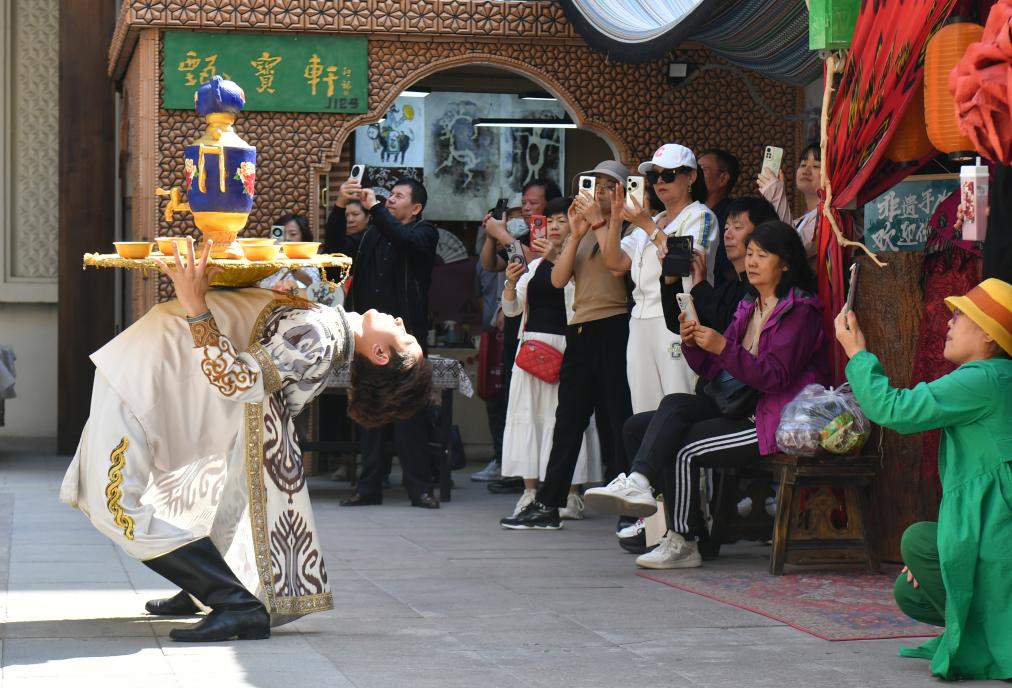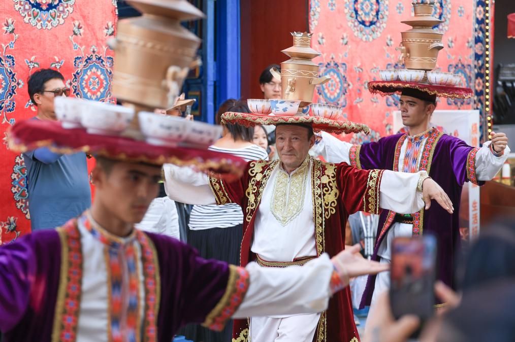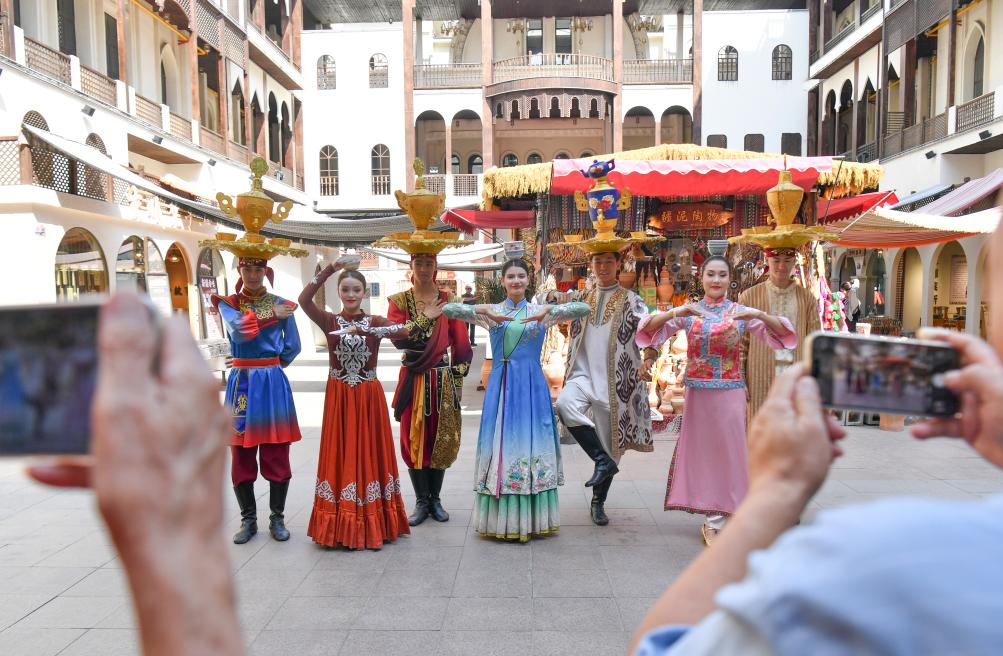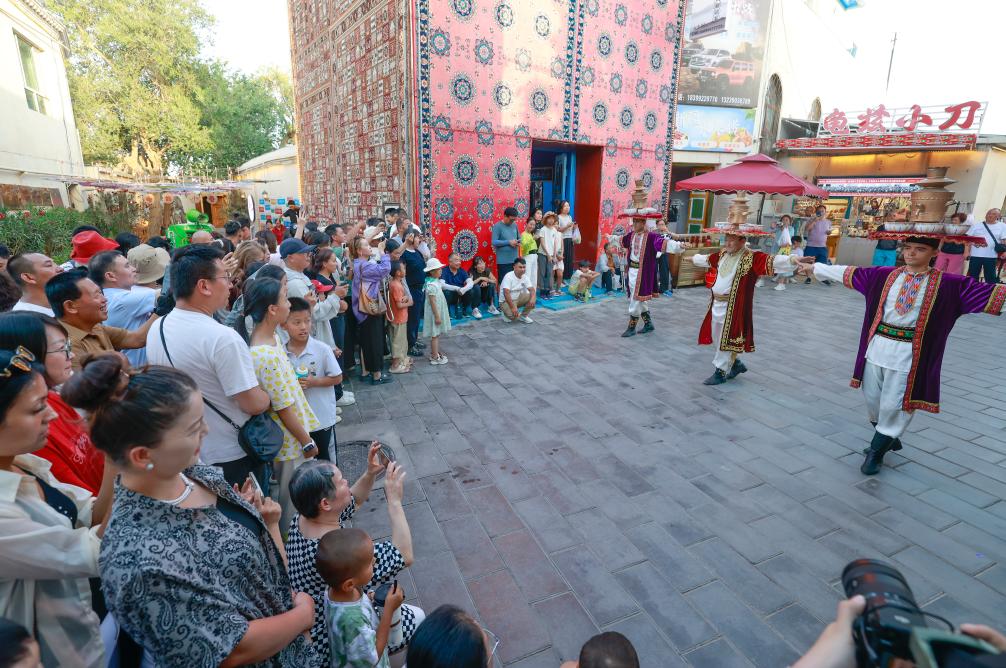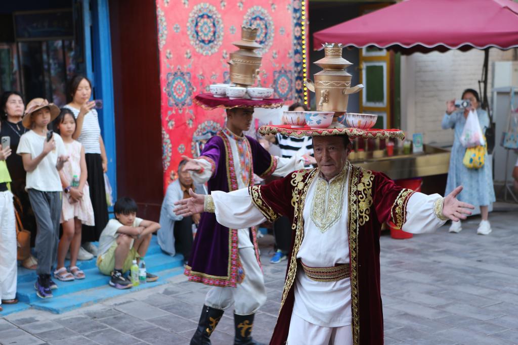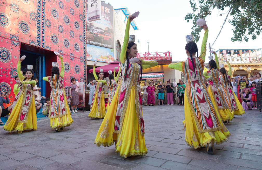 9月9日,在位于新疆乌鲁木齐的大巴扎步行街疆来城,演员在表演萨玛瓦尔舞。新华社记者 王菲 摄