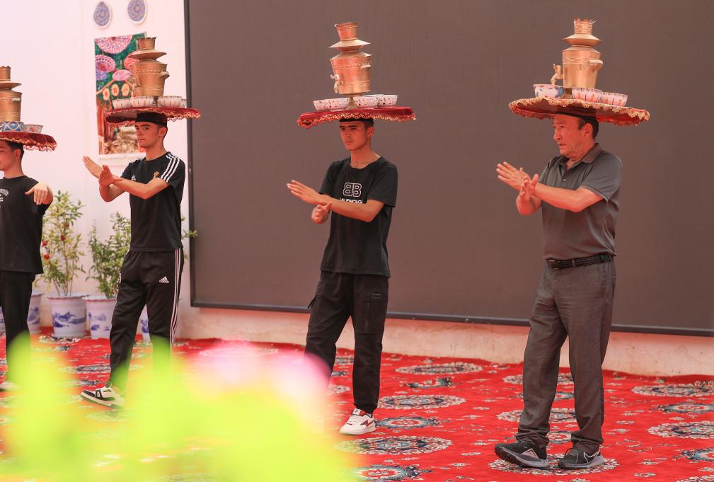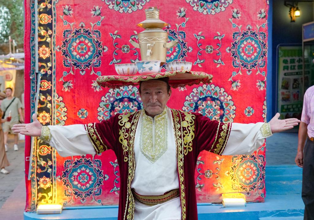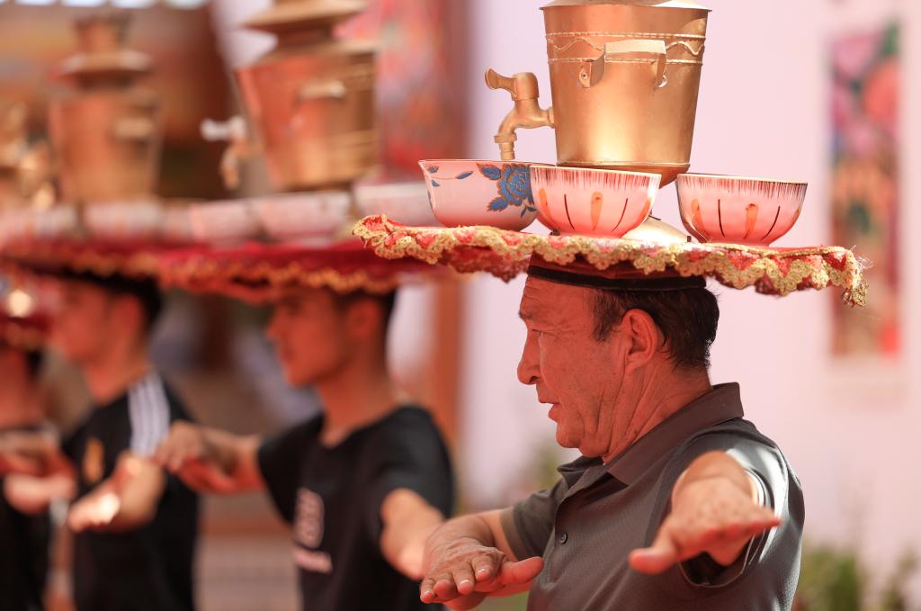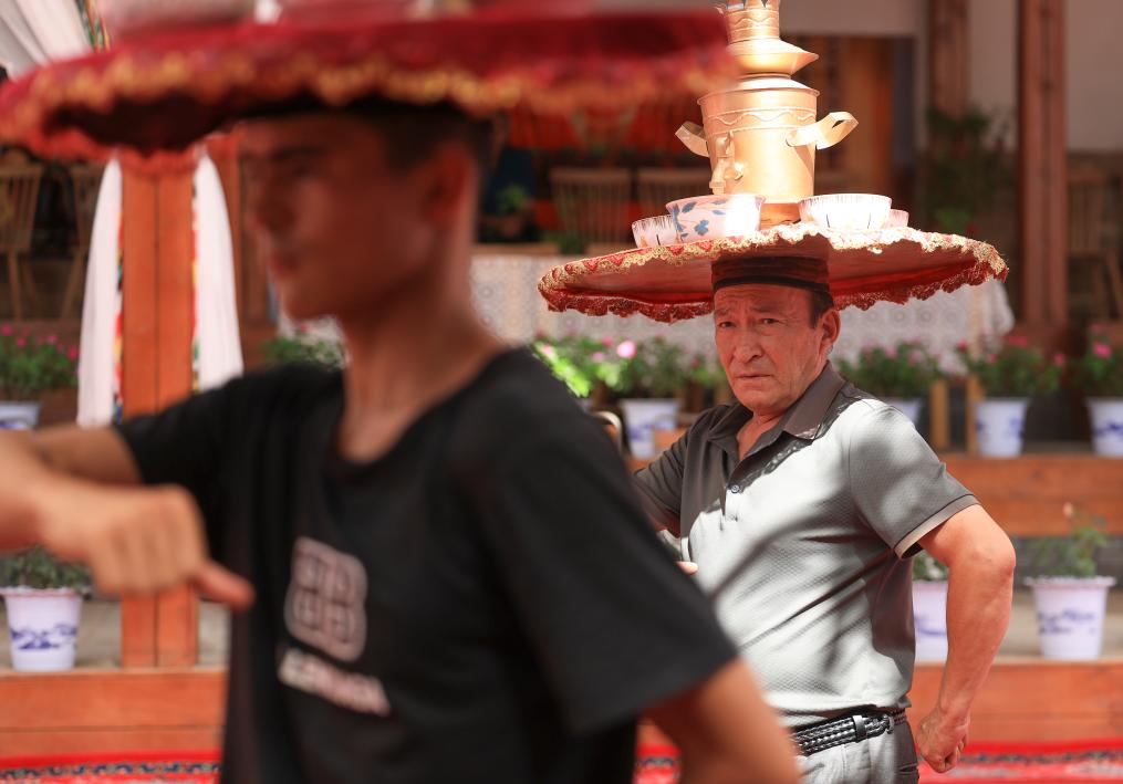 7月22日,在新疆库车市的龟兹小巷,演员表演顶碗舞。新华社记者 王婧嫱 摄