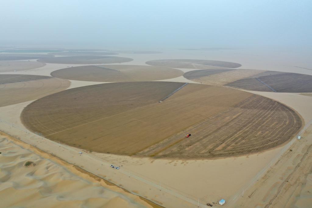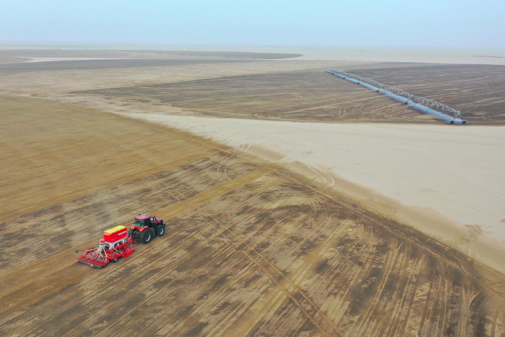 在新疆和田地区策勒县4万亩苜蓿种植基地,农机手驾驶机械在播种苜蓿(9月9日摄,无人机照片)。新华社记者 丁磊 摄