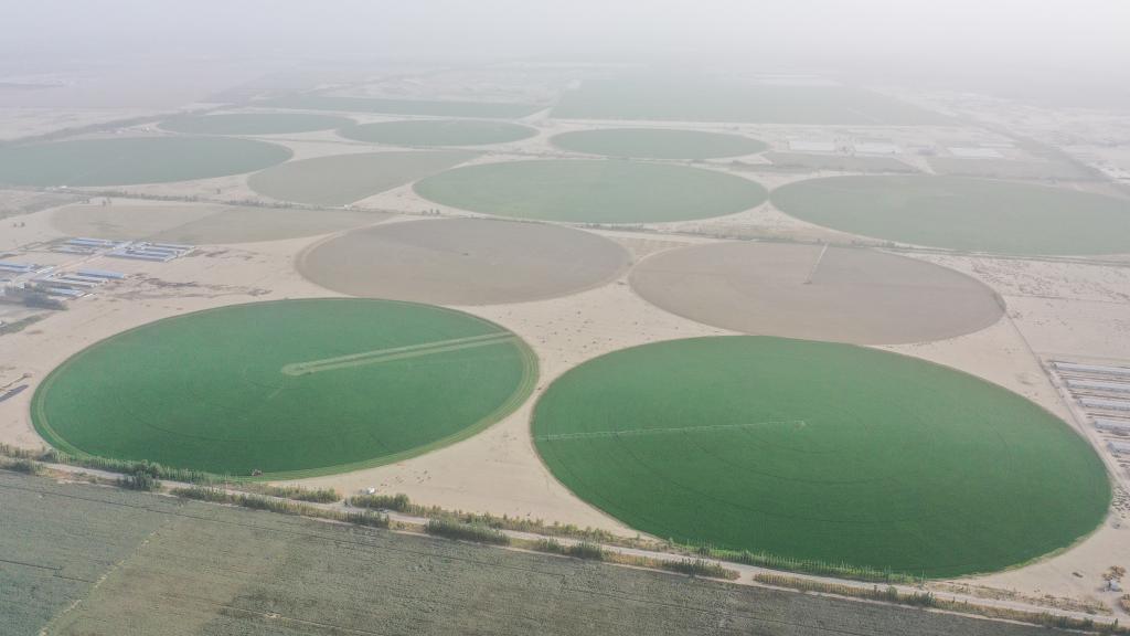 在新疆和田地区和田县千亩苜蓿种植示范基地,指针式喷灌机进行淋灌作业(9月9日摄)。新华社记者 丁磊 摄