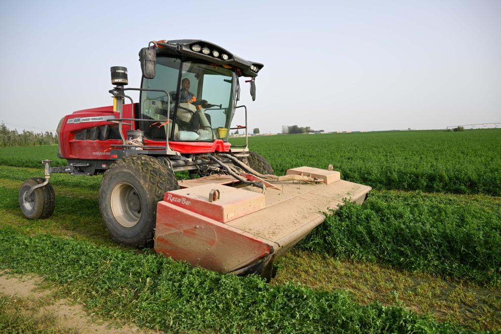 在新疆和田地区和田县千亩苜蓿种植示范基地,农机手驾驶机械收割苜蓿(9月10日摄)。新华社记者 丁磊 摄