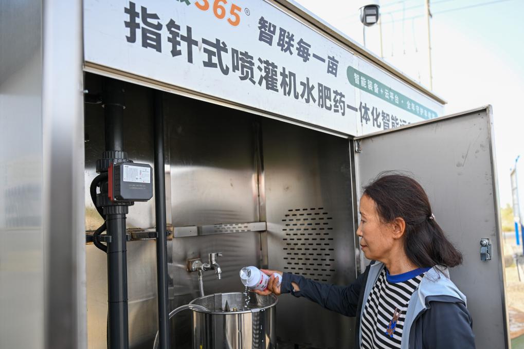 在新疆和田地区和田县千亩苜蓿种植示范基地,技术人员在水肥药一体化智能远程管控终端配制农药(9月10日摄)。新华社记者 丁磊 摄