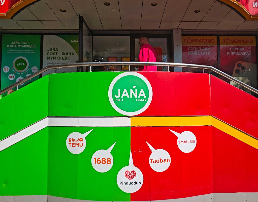 这是9月3日在哈萨克斯坦阿拉木图一家主要负责中国网购平台物流服务的快递网点外拍摄的宣传标识。