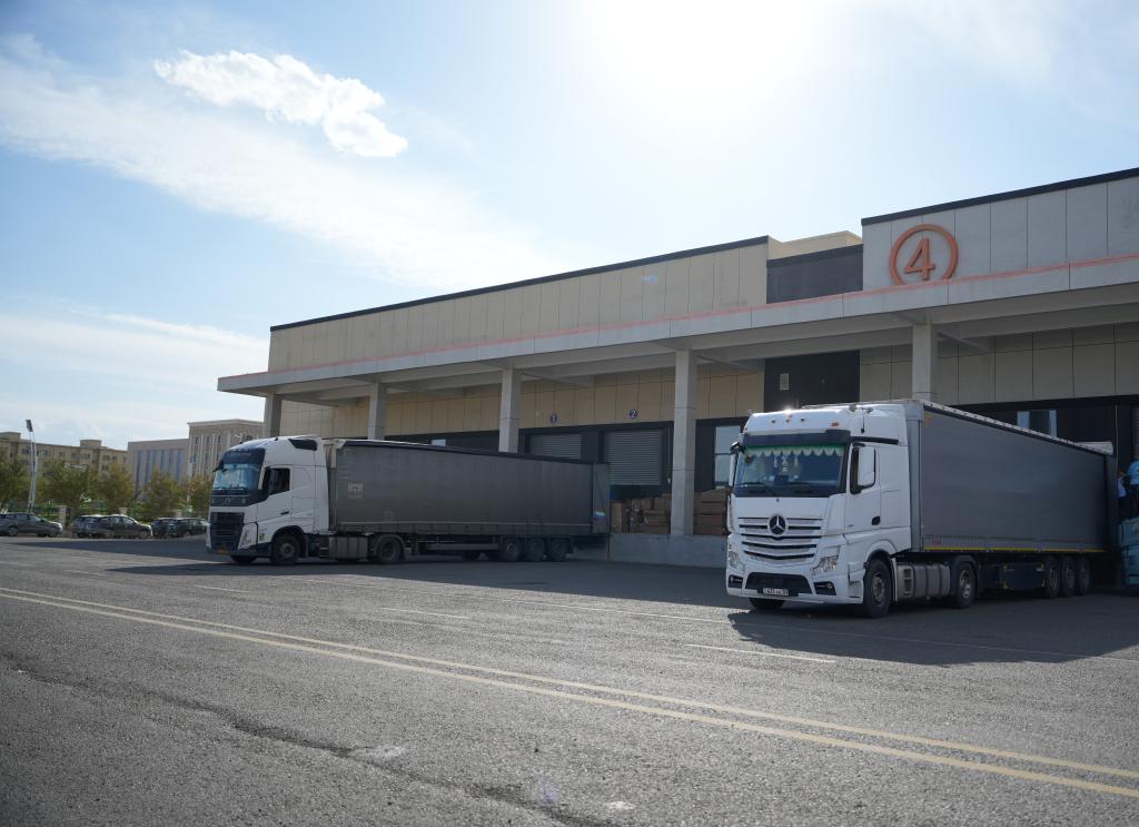 9月11日,在新疆阿拉山口跨境电商产业园,两辆来自哈萨克斯坦的货车在等待装货。