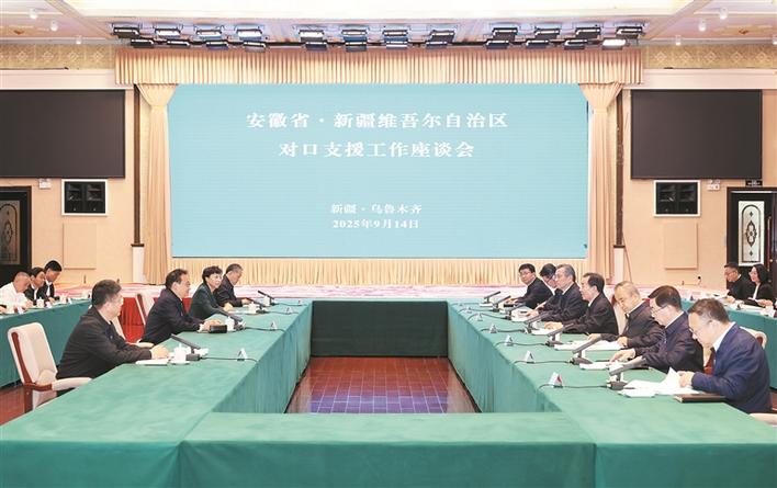 14日下午,安徽省·新疆维吾尔自治区对口支援工作座谈会在乌鲁木齐召开。梁言顺代表安徽省委、省政府对新疆长期以来给予安徽发展的支持表示感谢,对新疆经济社会发展取得的成就表示祝贺。他说,自2010年以来,安徽认真贯彻习近平总书记重要讲话重要指示精神和党中央决策部署,深入实施扶智、富民、安居、连心、固本“五大工程”,有力促进了和田及皮山社会稳定和经济发展。今年是新疆维吾尔自治区成立70周年。我们将立足新的起点,坚决扛牢对口援疆重大政治责任,充分发挥安徽和皮山两个方面优势,科学谋划“十五五”对口援疆目标任务,实施一批牵动性强的重大项目、重大工程,持续深化产业援疆、教育援疆、医疗援疆、人才援疆、文化润疆,助力皮山增强发展动能,推进群众增收,促进民族团结,推动实现供需匹配、相互赋能、共同发展,齐心协力把对口援疆工作推向深入。