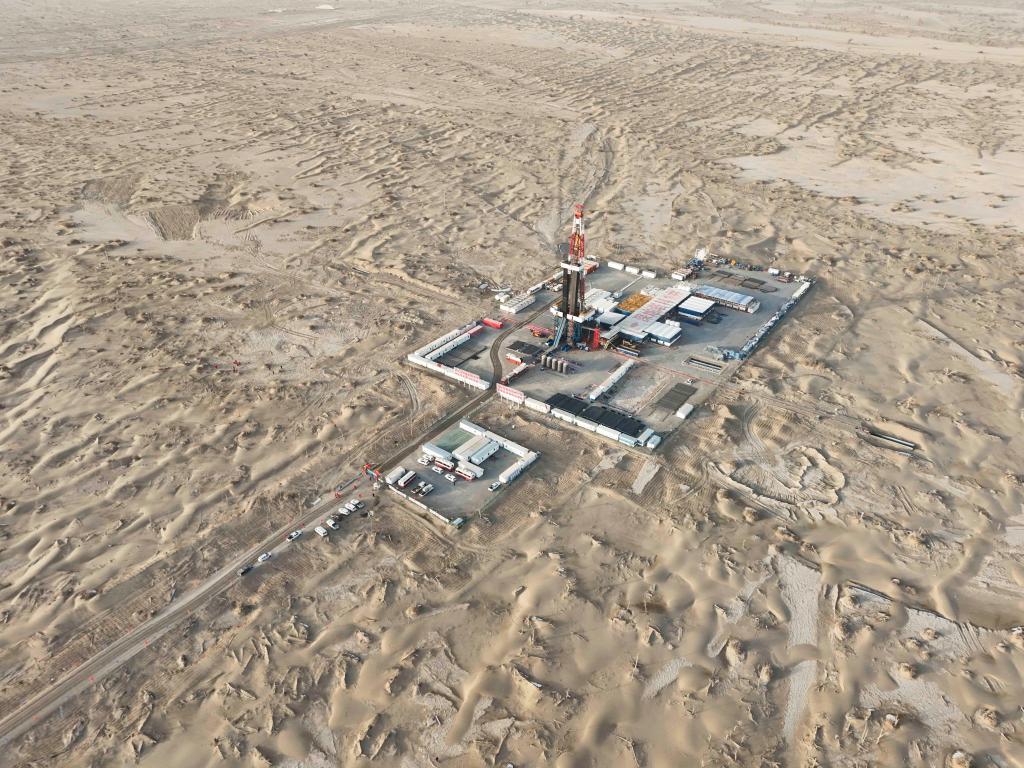 这是2025年2月18日在新疆塔克拉玛干沙漠腹地拍摄的中国石油塔里木油田深地塔科1井(无人机照片)。新华社记者 胡虎虎 摄