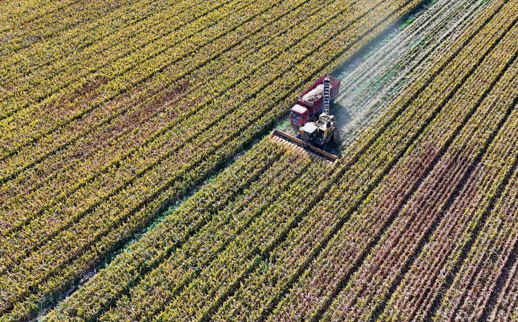 在新疆伊犁哈萨克自治州新源县的农田里,收割机在采收玉米。(受访单位供图)