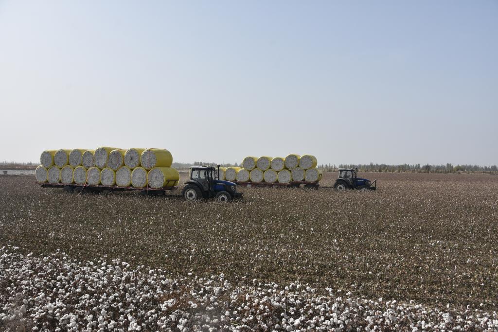 10月21日,在新疆阿克苏地区沙雅县的棉田中,叉车将打包好的棉花装车。新华社记者 顾煜 摄