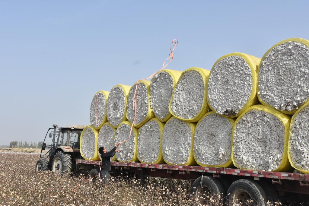 走进沙雅县红旗镇多勒昆村宽阔平坦的千亩高标准棉田,雪白的棉朵缀满棉枝,采棉机穿梭在棉田之间,伴随着阵阵轰鸣声,饱满的棉絮被源源不断吸入机身,不一会儿,一个个紧实的圆柱形棉包便从采棉机尾部滚落,排列在田间。