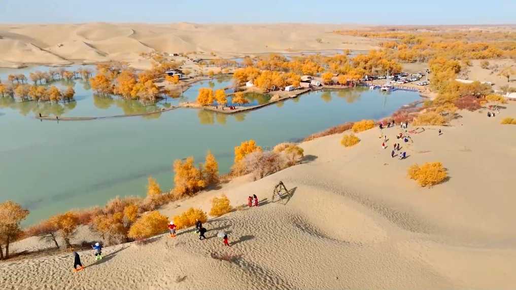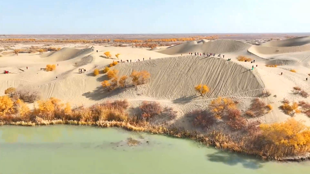 金秋时节,新疆巴音郭楞蒙古自治州尉犁县葫芦岛胡杨金黄,碧波荡漾,引来众多游客。