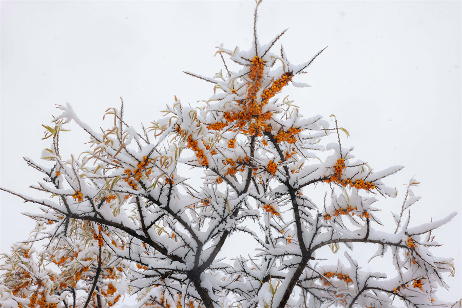 河流在雪原中如墨带蜿蜒穿梭,飞鸟静立雪枝,沙棘树的橙红果实缀于琼枝间,与白雪相映。冬雪轻拢万物,将草原的辽阔、森林的深邃、牧群的悠然编织成一幅静谧却不失生机的立冬图景,每一处景致都流淌着“塞外江南”的冬日诗意。