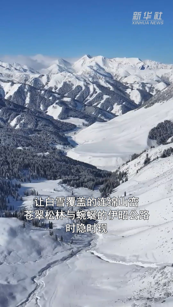 山间云雾升腾,或浓或淡萦绕峰峦,让白雪覆盖的连绵山峦、苍翠松林与蜿蜒的伊昭公路时隐时现。