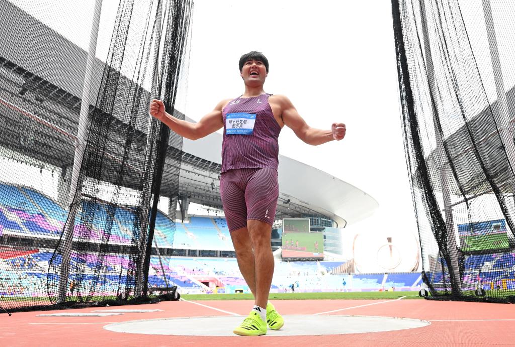 11月20日,新疆队选手阿卜杜艾尼·图尔贡在试投后庆祝。他以64米40的成绩夺得冠军。新华社记者 江汉 摄