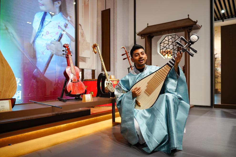 11月28日,在新疆中哈霍尔果斯国际边境合作中心中国文化馆,参加活动的青年穿着中国传统服饰体验琵琶弹唱。新华社记者 徐宏岩 摄